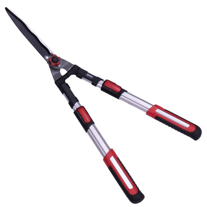 Tesoura corta sebes de duas mãos. Lâmina de aço temperado com revestimento antiaderente de teflon. Gume ondulado para uma boa aderência no ramo e corte fácil. Cabos telescópicos de 68 a 88 cm de comprimento. Cabos de alumínio leves e fortes. Pegas ergonómicas e antiderrapantes. Topos amortecedores integrados.
